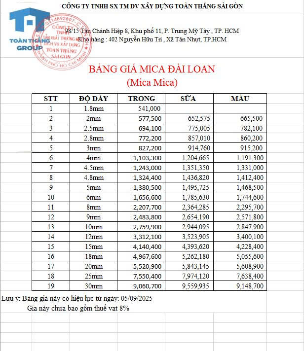 | Mica Đài Loan | 190,000 - 9,860,000đ/tấm | 3-30mm |