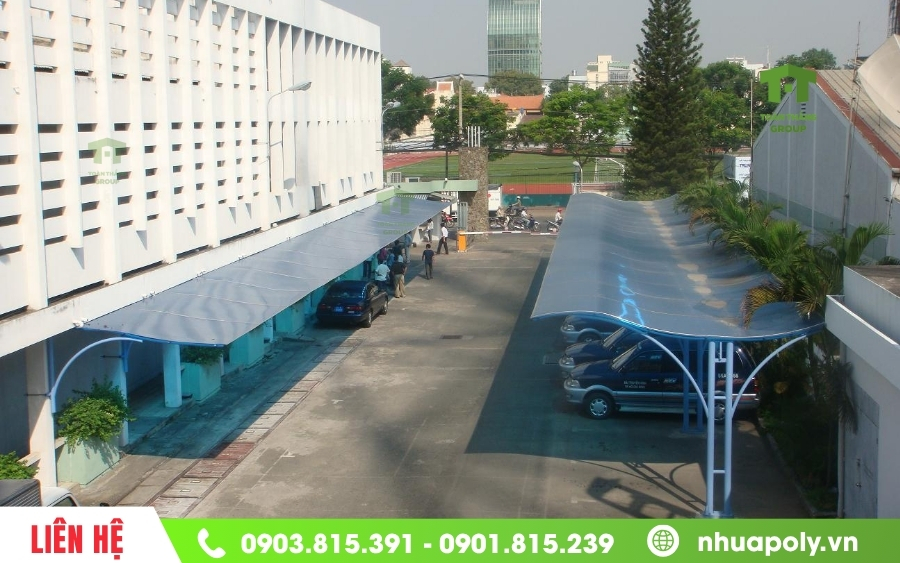 - Bãi giữ xe công ty, khu công nghiệp: Thường dùng tấm Poly rỗng ruột khổ lớn để bao phủ diện tích rộng, vừa đảm bảo xe công nhân viên không bị nóng, vừa tối ưu chi phí đầu tư.